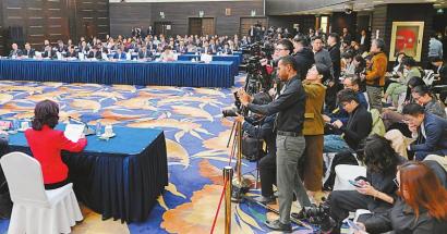 3月10日,出席十四屆全國人大二次會議的四川代表團(tuán)在駐地舉行全體會議,并向中外媒體開放。圖為中外媒體記者在現(xiàn)場采訪拍攝。川報(bào)集團(tuán)特派記者 歐陽杰 攝