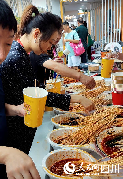 賽前球迷們?cè)诩文耆A享受樂(lè)山缽缽雞。人民網(wǎng) 羅昱攝