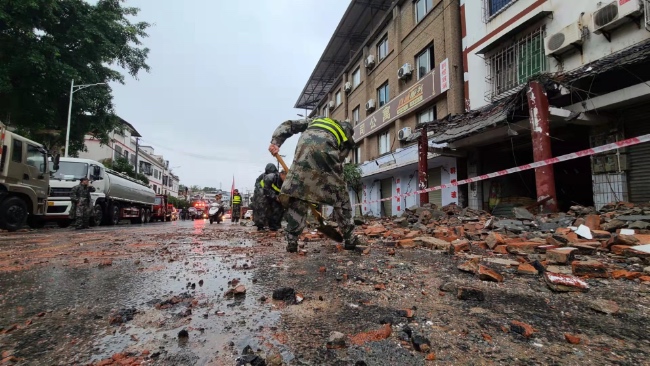 受災(zāi)較重的福集鎮(zhèn)到處是散落的水泥磚塊,應(yīng)急救援隊加緊各項搶修。人民網(wǎng) 朱虹攝