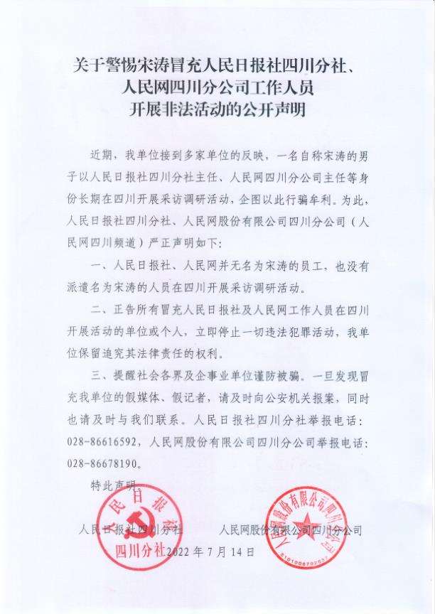 近期,我單位接到多家單位的反映,一名自稱宋濤的男子以人民日?qǐng)?bào)社四川分社主任、人民網(wǎng)四川分公司主任等身份長期在四川開展采訪調(diào)研活動(dòng),企圖以此行騙牟利。為此,人民日?qǐng)?bào)社四川分社、人民網(wǎng)股份有限公司四川分公司(人民網(wǎng)四川頻道)嚴(yán)正聲明如下: