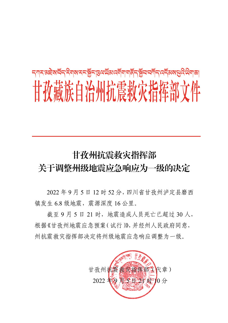 截至9月5日21時(shí),地震造成人員死亡已超過(guò)30人,根據(jù)《甘孜州地震應(yīng)急預(yù)案(試行)》,并經(jīng)甘孜州人民政府同意,甘孜州抗震救災(zāi)指揮部決定將州級(jí)地震應(yīng)急響應(yīng)調(diào)整為一級(jí)。