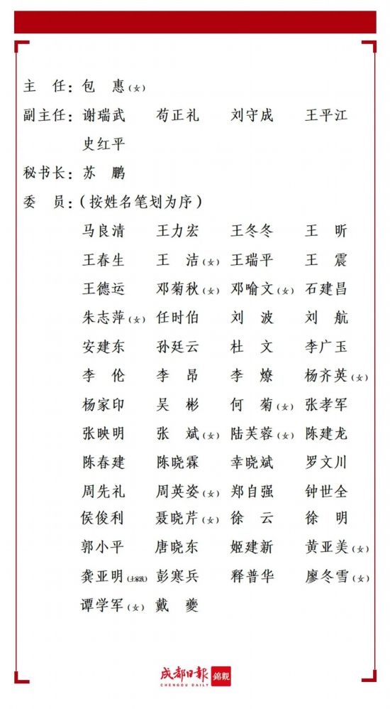 成都市第十八屆人民代表大會(huì)第一次會(huì)議于2023年2月24日依法選出成都市第十八屆人民代表大會(huì)常務(wù)委員會(huì)主任、副主任、秘書長(zhǎng)、委員,名單如下: