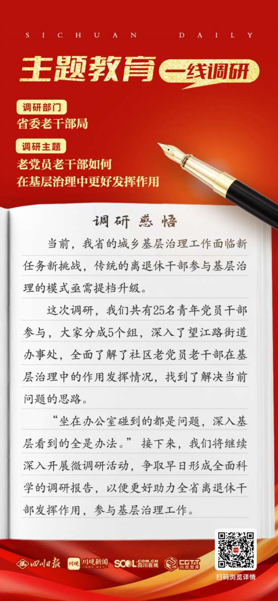 “這其實(shí)也是全省面上的問(wèn)題,老黨員老干部發(fā)揮作用,需要以身體健康為前提,我們前期通過(guò)不斷實(shí)踐,已經(jīng)初步搭建起了老黨員老干部的作用發(fā)揮平臺(tái),一大批老黨員老干部走出家門,走向了社區(qū),成為了基層治理的重要力量,現(xiàn)在則需要解決這個(gè)平臺(tái)的‘接班人’問(wèn)題?!闭{(diào)研組成員們一邊認(rèn)真記錄,一邊展開(kāi)熱議。