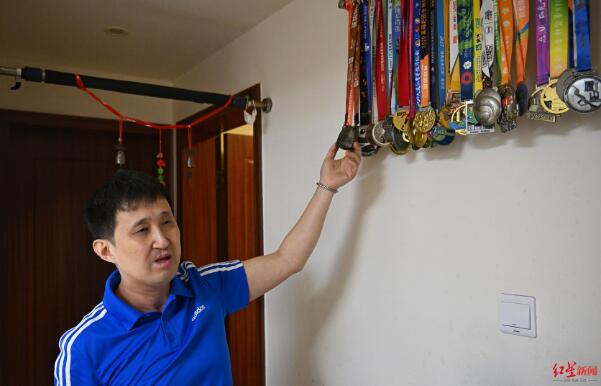 北京、西昌、敦煌、眉山、遂寧、南充……陳光炅借助馬拉松,通過奔跑的力量去了一座座城市。各個城市的馬拉松賽事獎牌被他掛在客廳里,一根欄桿滿滿當當。期間,陳光炅還以自己的跑步經(jīng)歷為主題寫了一本書《黑暗馬拉松》。