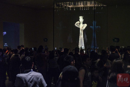 三星堆博物館內(nèi),游客爭相一睹青銅大立人。